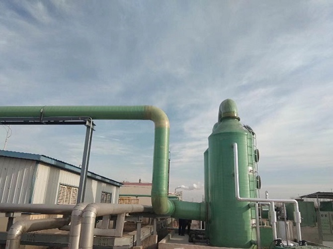 玻璃鋼吸收塔分為、上塔體、筒體、循環液糟組成,塔內有兩層填料,一層斜波紋板、二層階梯環,具有較大的表面積氣液接觸,充分傳質效率高。